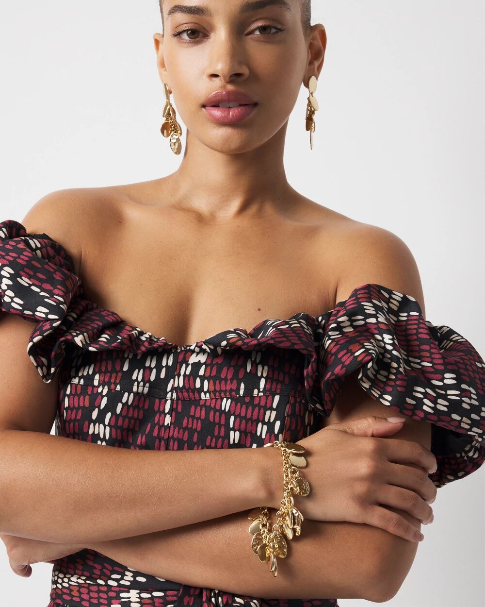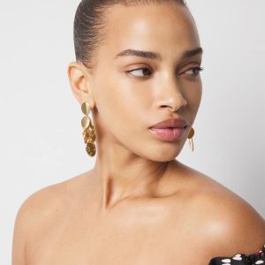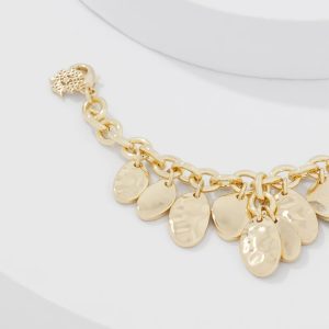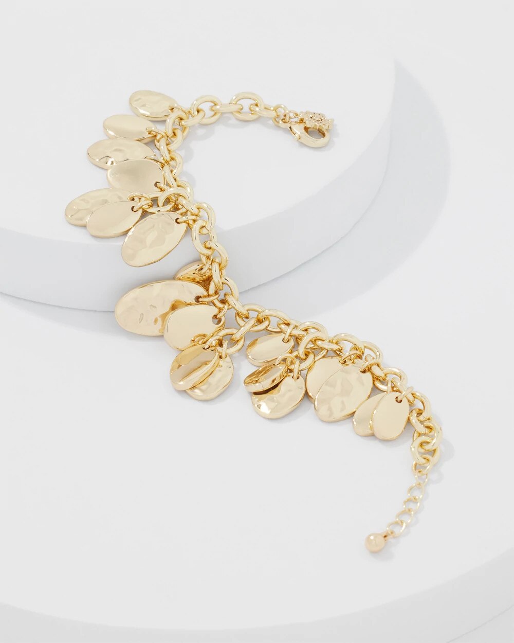 An array of delicate gold hammered discs hang on this chain bracelet. It’s an easy way to add shine and texture to minimalist outfitting.