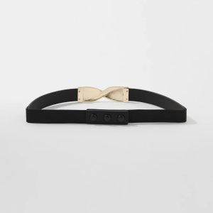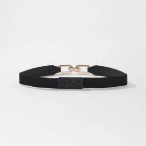 Elevate your dresses with this black stretch belt that features a gold link detail at the center front. The belt opens and closes in the back.