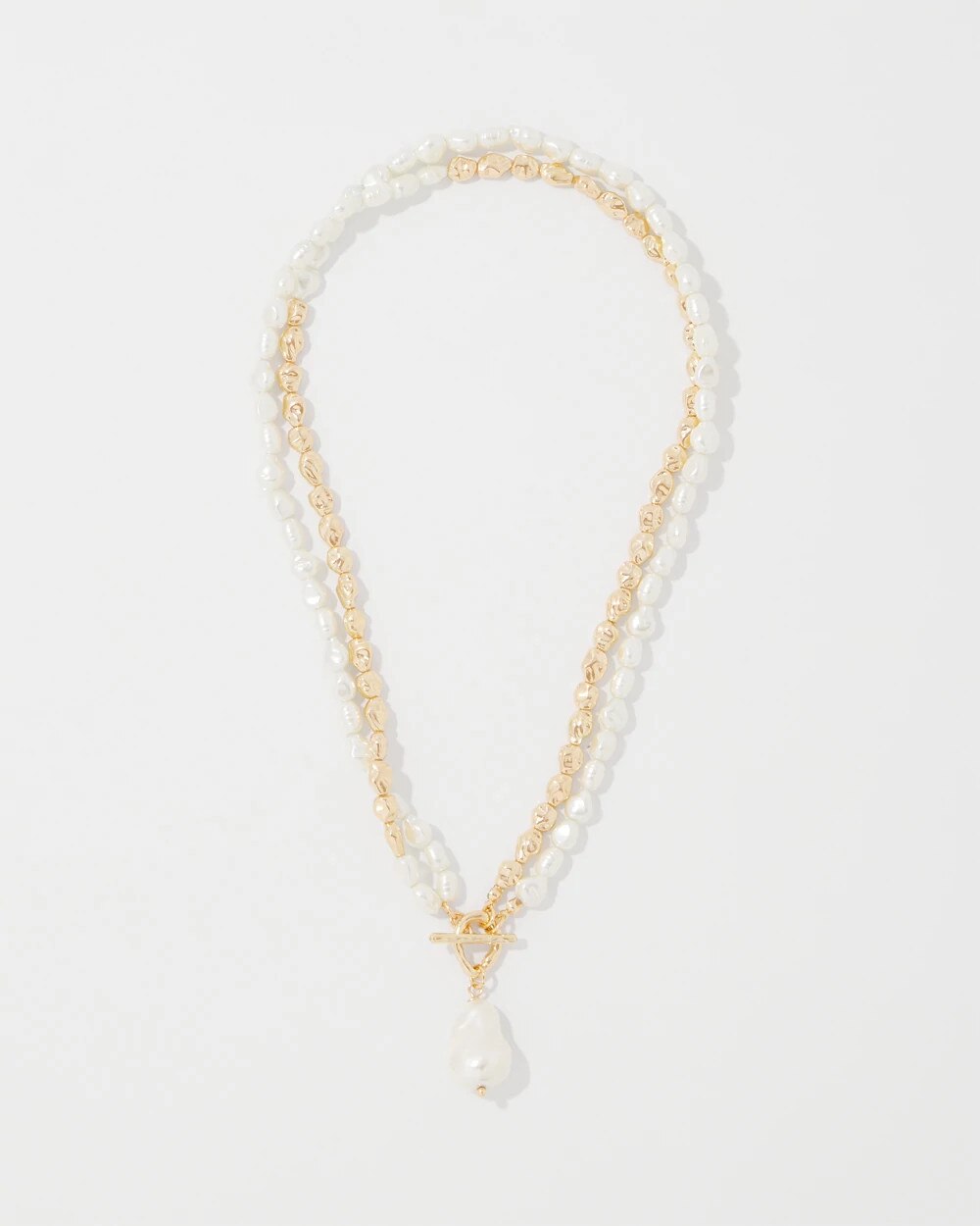A large single faux pearl is the focal point of this two-strand necklace that easily converts into one long single strand piece. An easy way to elevate any outfit. Mix and match with other pieces from our Baroque Pearl Collection.