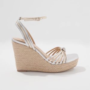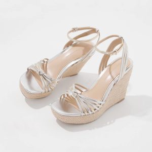 This classic strappy wedge shoe has silver and gold faux leather straps that knot at the center. A great look for maxi dresses or shorts, wedges keep you from sinking into the grass or dirt at garden parties, rodeos or polo matches.