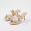 A faux leather strappy sandal is a wardrobe must-have, a heel of twisted gold adds a touch of glam to your outfit. Shop the Twisted Metals Collection for coordinating belt, bag and bootie.