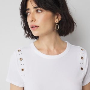 We’ve elevated this timeless crewneck tee by adding grommet and stud details at the front and back of the shoulders. The relaxed fit is on-trend and pairs perfectly with your favorite denim or shorts.