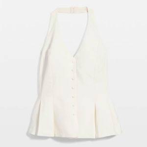 This halter top has a row of buttons down the center front as a design detail (they’re non-functional) and a feminine peplum hem. A back zipper as well as hook & eye at the back of the halter neck gets you in and out. The summer crepe fabric is the perfect weight for the season and pairs perfectly with our matching open front jacket, crepe tailored short and wide leg pant.