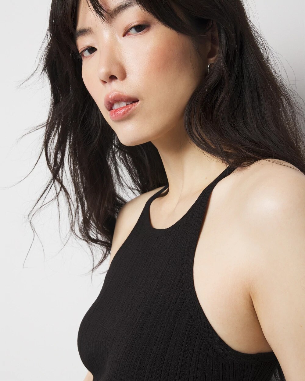 Sexy yet polished is how we describe this sweater halter dress made from an easy and stretchy crinkle rib knit fabric.
