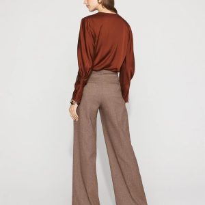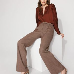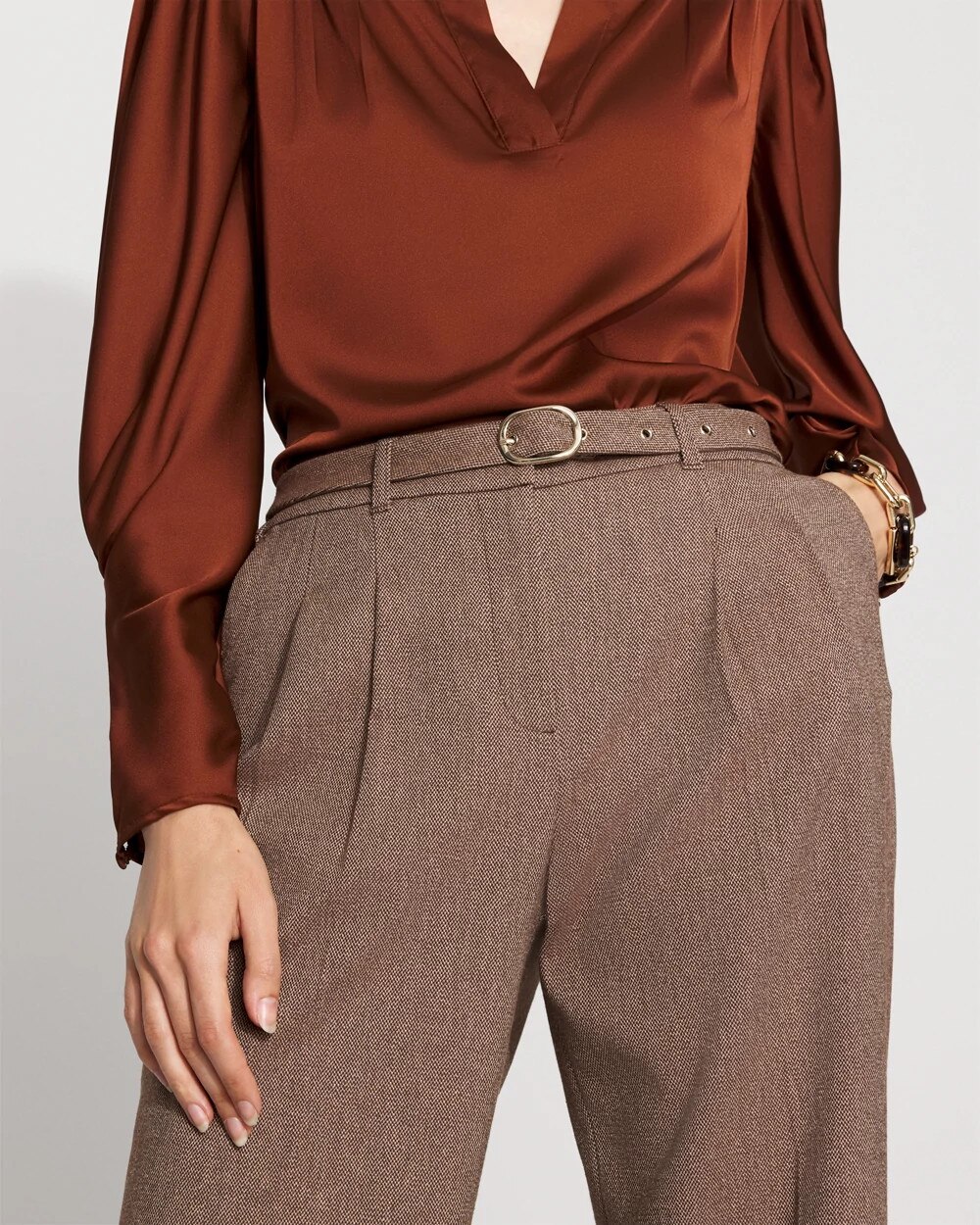 Fall outfitting just got easier with these pleated wide-leg pants cut from a classic tweed fabric. A detachable belt is designed with a gold buckle for a hint of shine.