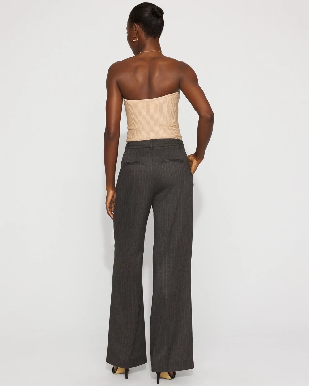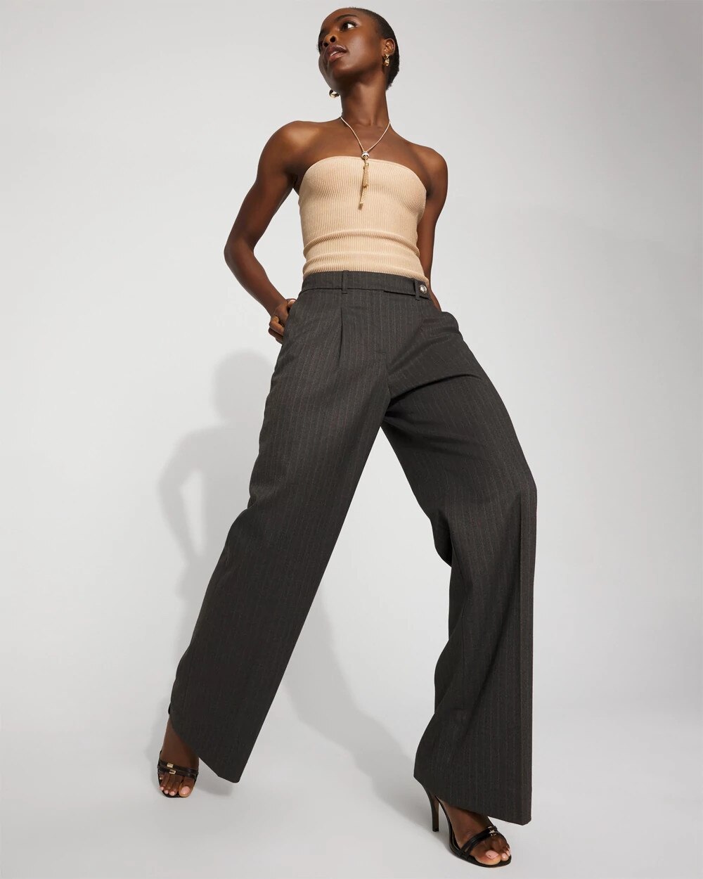 Taking inspo from classic menswear style, we designed these pinstriped wide-leg pants with front pleats and an extended tab closure on the waist.