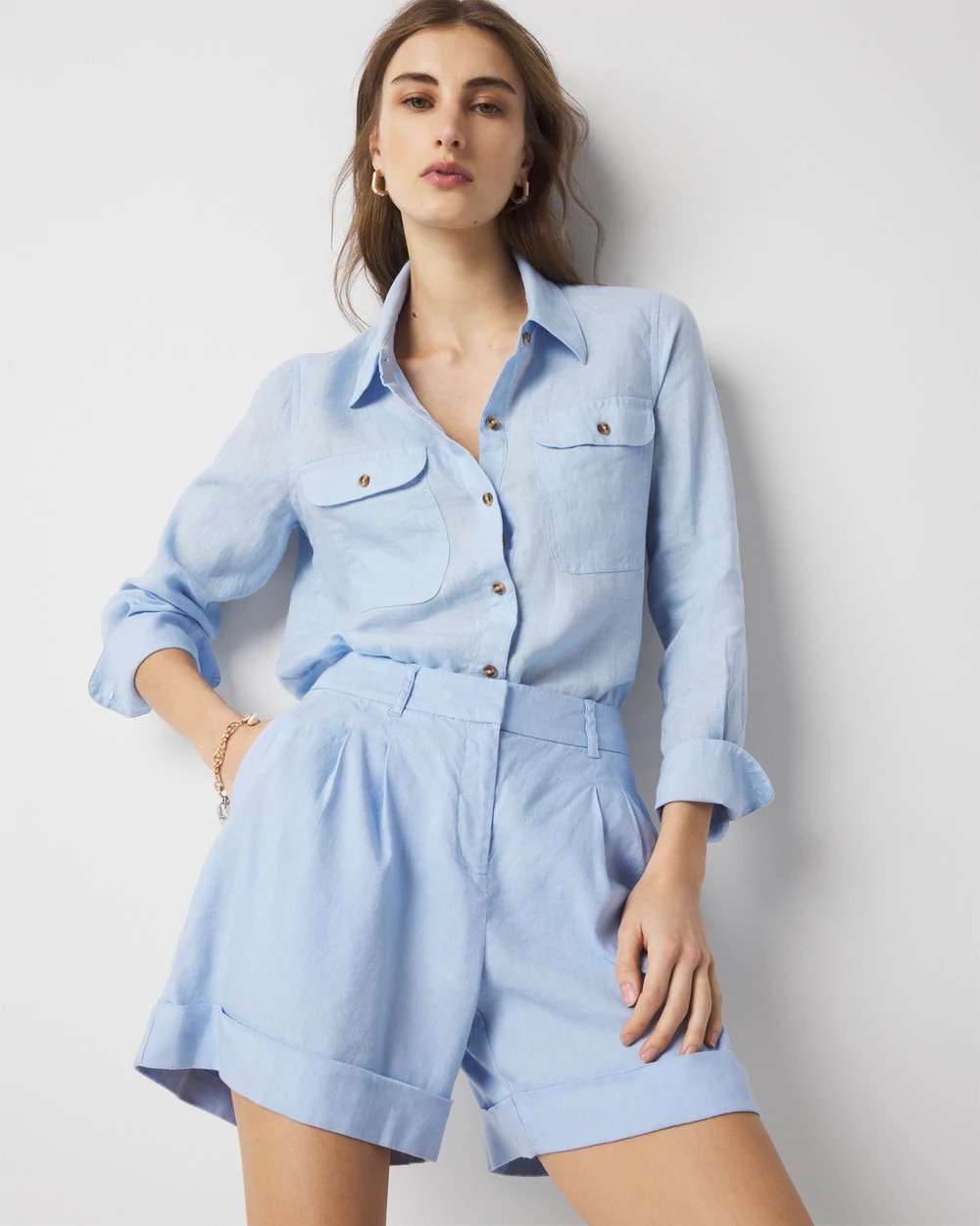 These tailored shorts are made from a linen-blend fabric and have front pleats and cuffs as well as front and back pockets. These shorts can be dressed up with heels and a blazer or keep it casual with sandals or sneakers.