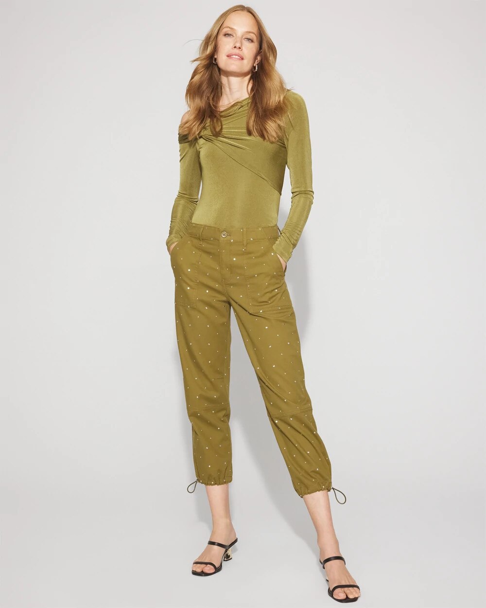Part of our Pret Collection, this relaxed ankle pant has adjustable drawstrings on the cuffs as well as the cargo and patch pockets you covet. Allover silver studs embellish these pants for a hint of shine and added texture. Wear it with our Pret Studded Jacket for a complete look.