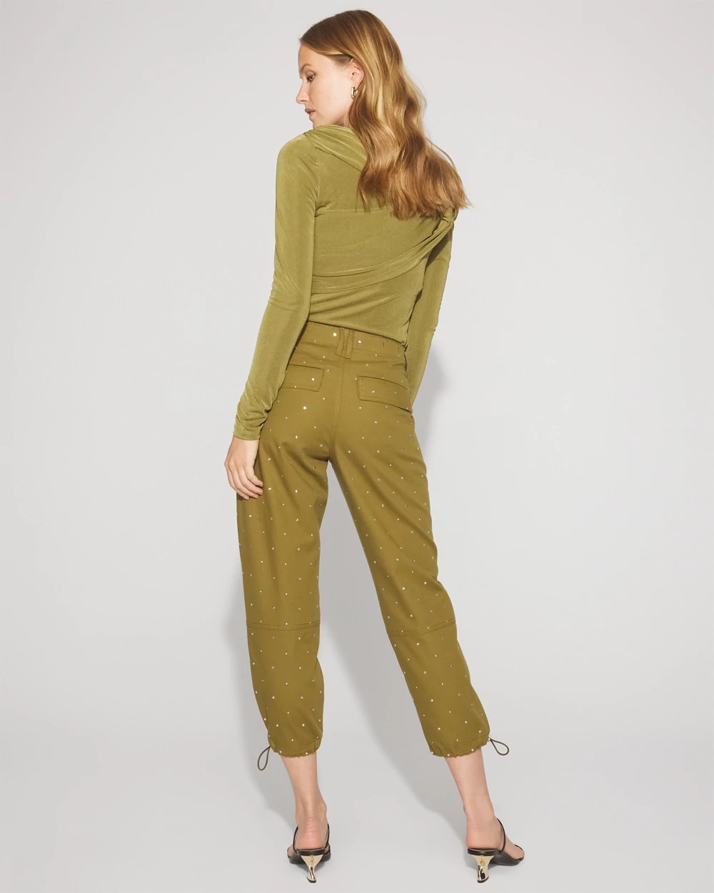 Part of our Pret Collection, this relaxed ankle pant has adjustable drawstrings on the cuffs as well as the cargo and patch pockets you covet. Allover silver studs embellish these pants for a hint of shine and added texture. Wear it with our Pret Studded Jacket for a complete look.