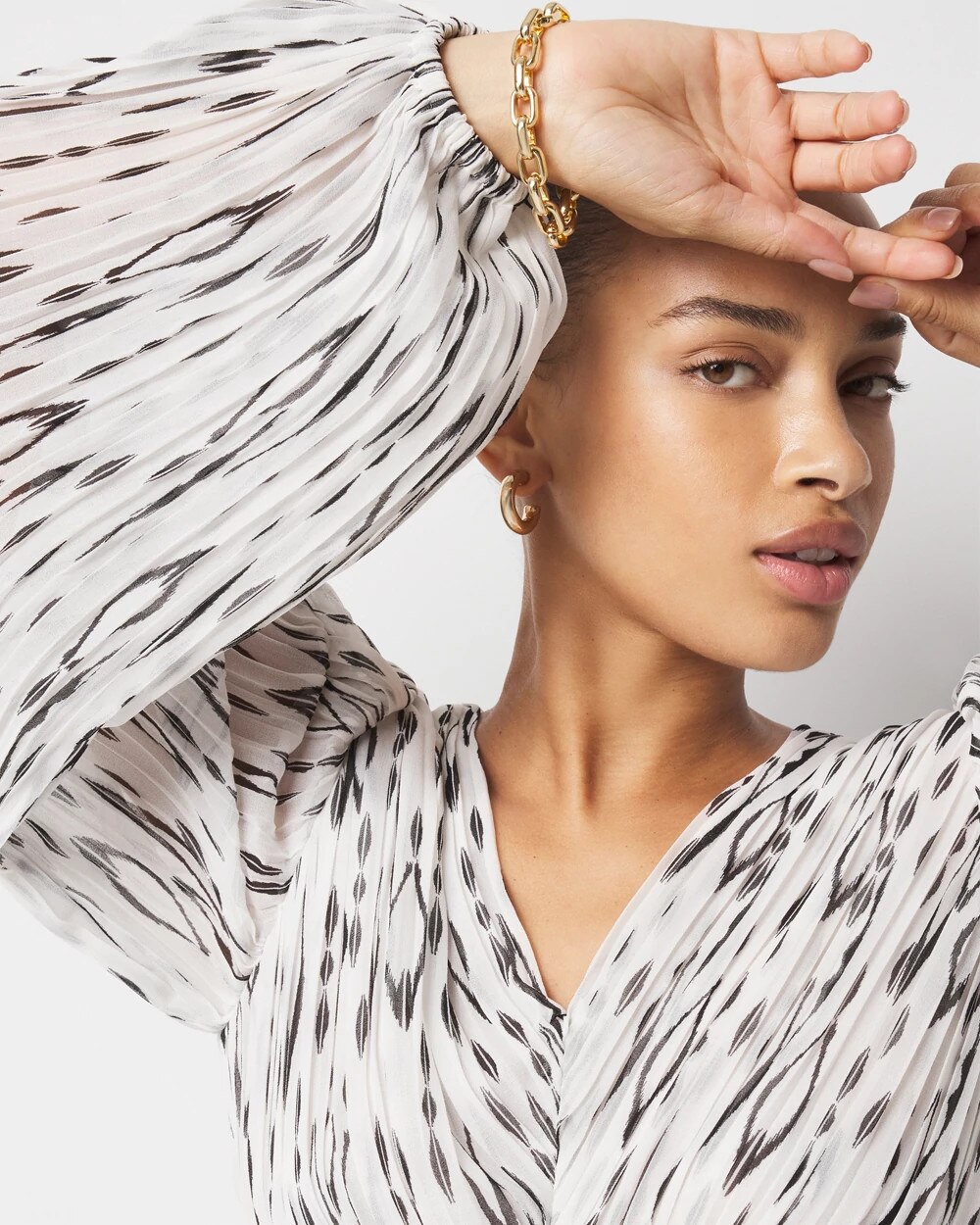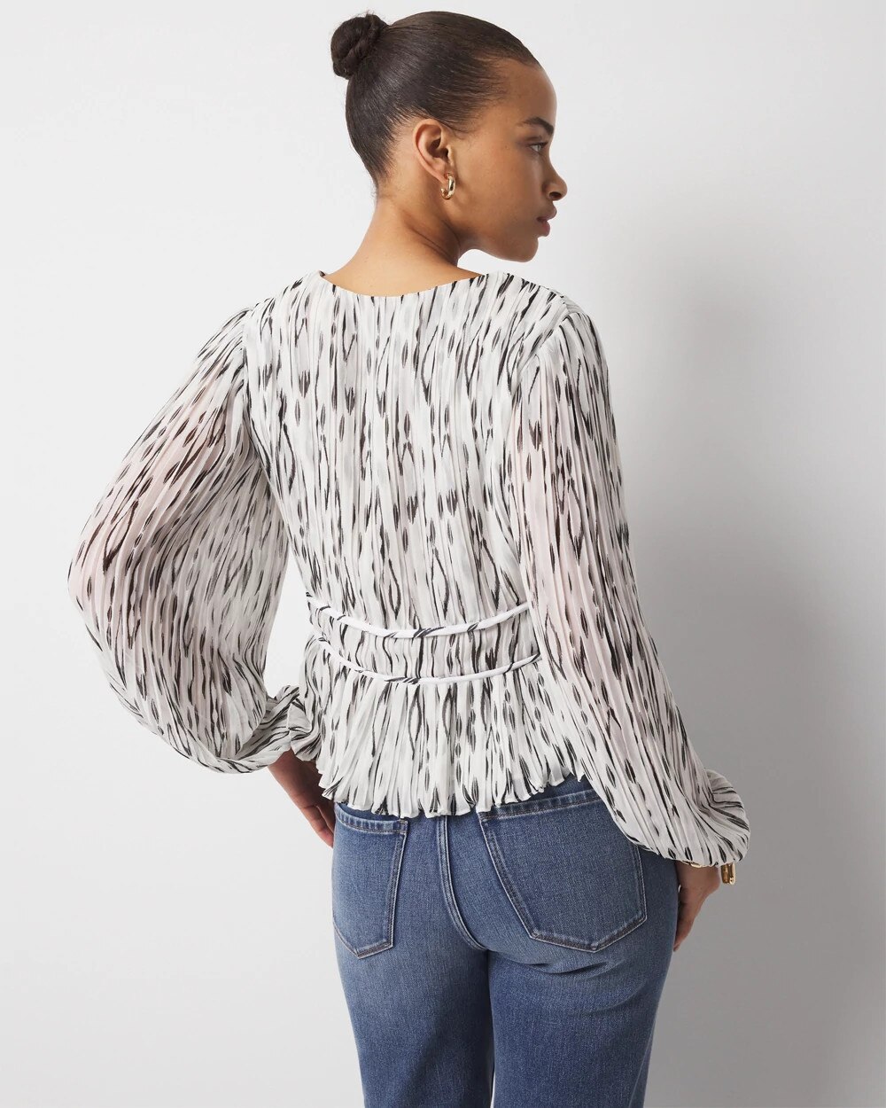 Allover pleats, peplum hem and seam details to define the waist will flatter and add a touch of romance to your outfit. The ikat print is timeless and adds a striking look to this boho-chic blouse. Elastic at the cuffs allow for a blouson effect.