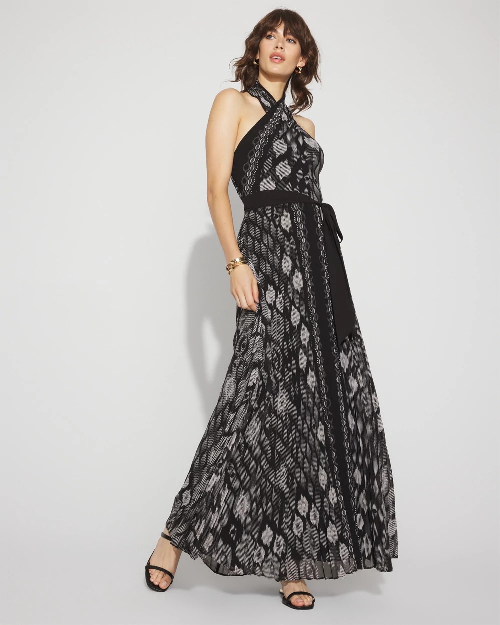 A stunning ikat print and pleated skirt elevates this crossover halter maxi dress. A sash defines your waistline. An easy look to take you from beach to brunch.