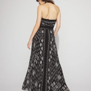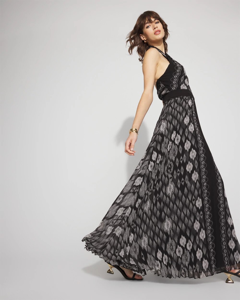 A stunning ikat print and pleated skirt elevates this crossover halter maxi dress. A sash defines your waistline. An easy look to take you from beach to brunch.