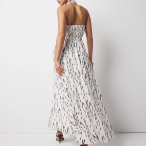 Featuring a backless halter top and a flowy maxi skirt, this dress also features a shaping banded waist, smocking in back for ease and a side slit. The timeless ikat print gets a dose of glam from gold lurex stripes throughout.