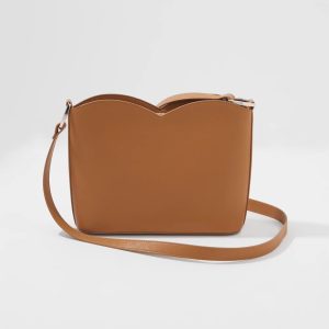 This charming faux leather bag is designed with an interlocking design detail and a sweetheart edge. Champagne gold hardware and a zipper closure elevate this classic crossbody purse. Pair with matching belt and shoe for a complete look.