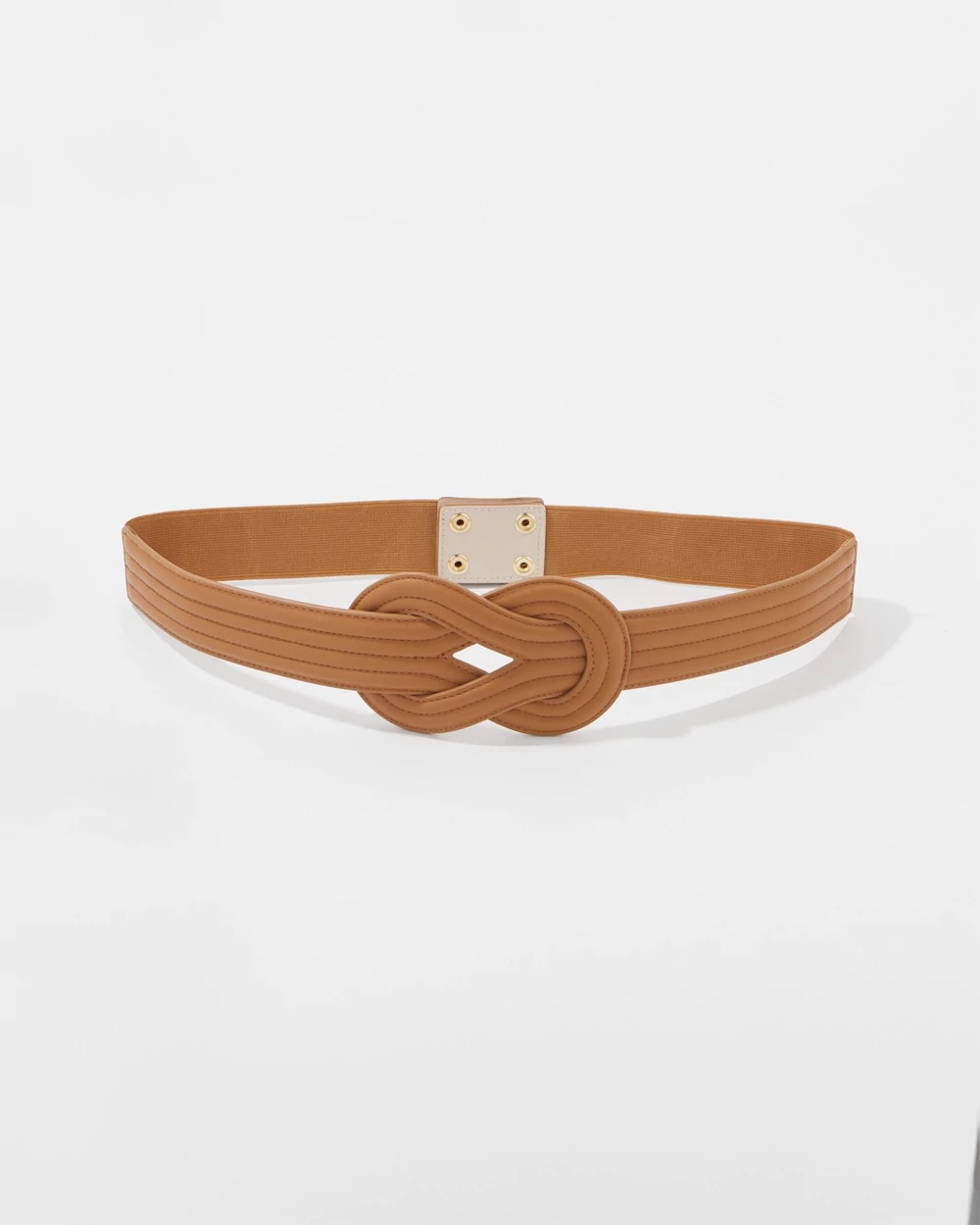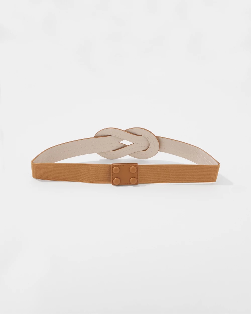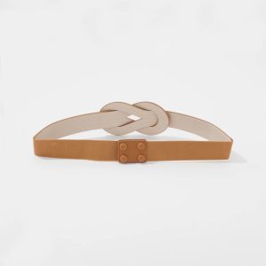 This stretch waist belt has an interlock design, giving it an elevated look that will complement an array of dresses. The easy snap closure makes it easy to wear. Match with crossbody bag and shoes for a chic look.