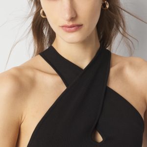 This flirty halter dress has a keyhole cutout at the bust and cutout work at the hem. A classic bodycon look for a special night out.