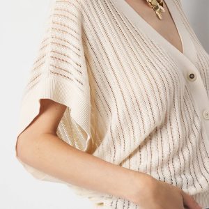 An open stitch pattern gives this cardi a slightly sheer look that’s perfect as a summer layer. Soft gold buttons and kimono sleeves make it fashion.