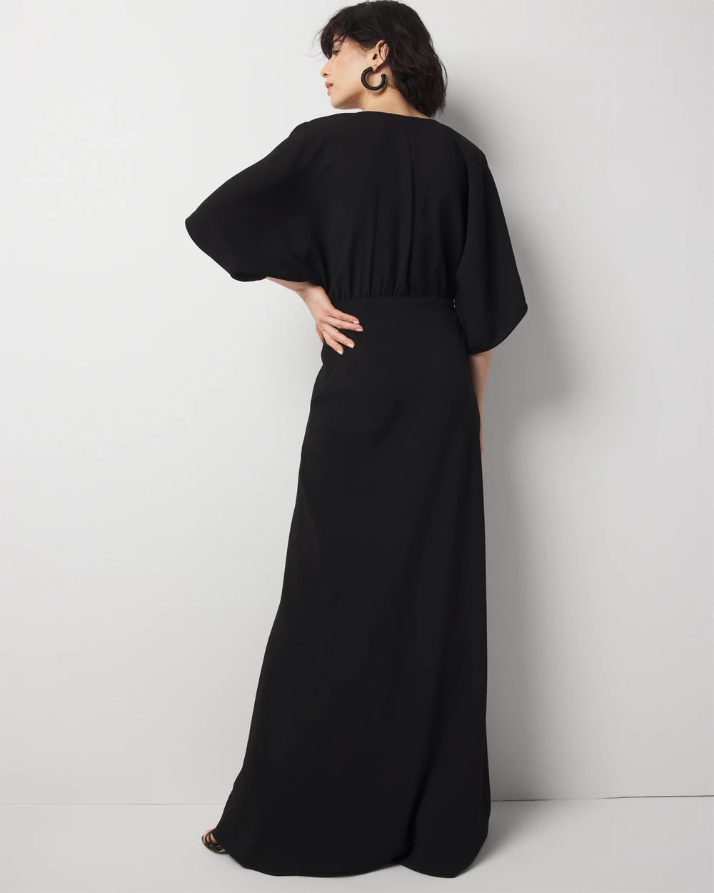 Cue the red carpet, this stunning gown gives us Old Hollywood vibes. Designed with kimono sleeves with a plunging V-neck, this maxi dress has lots of flowy movement thanks to the drapey crepe fabric. The perfect look for any formal or dressy occasion.