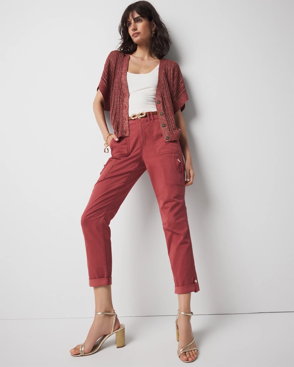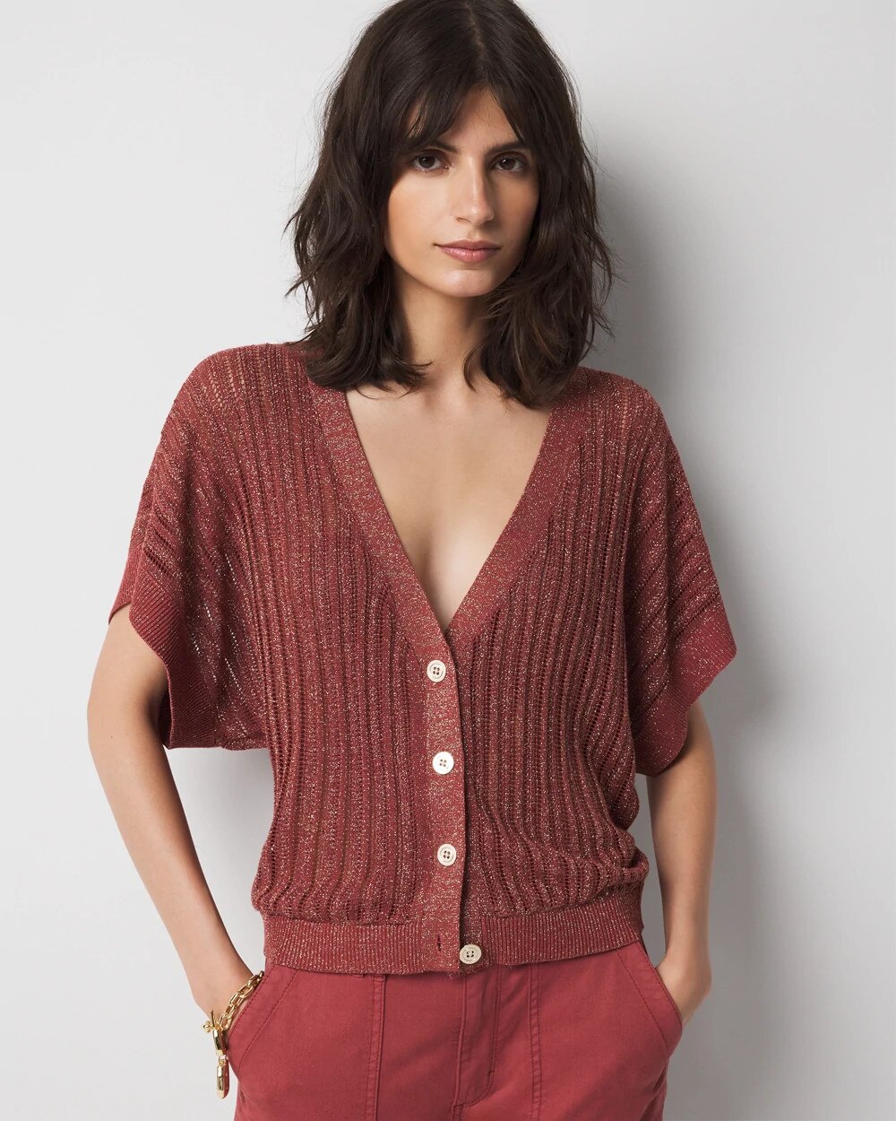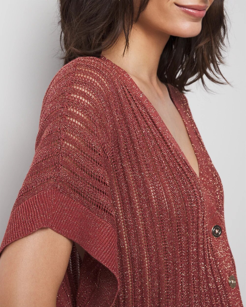 An open stitch pattern gives this cardi a slightly sheer look that’s perfect as a summer layer. Soft gold buttons and kimono sleeves make it fashion.