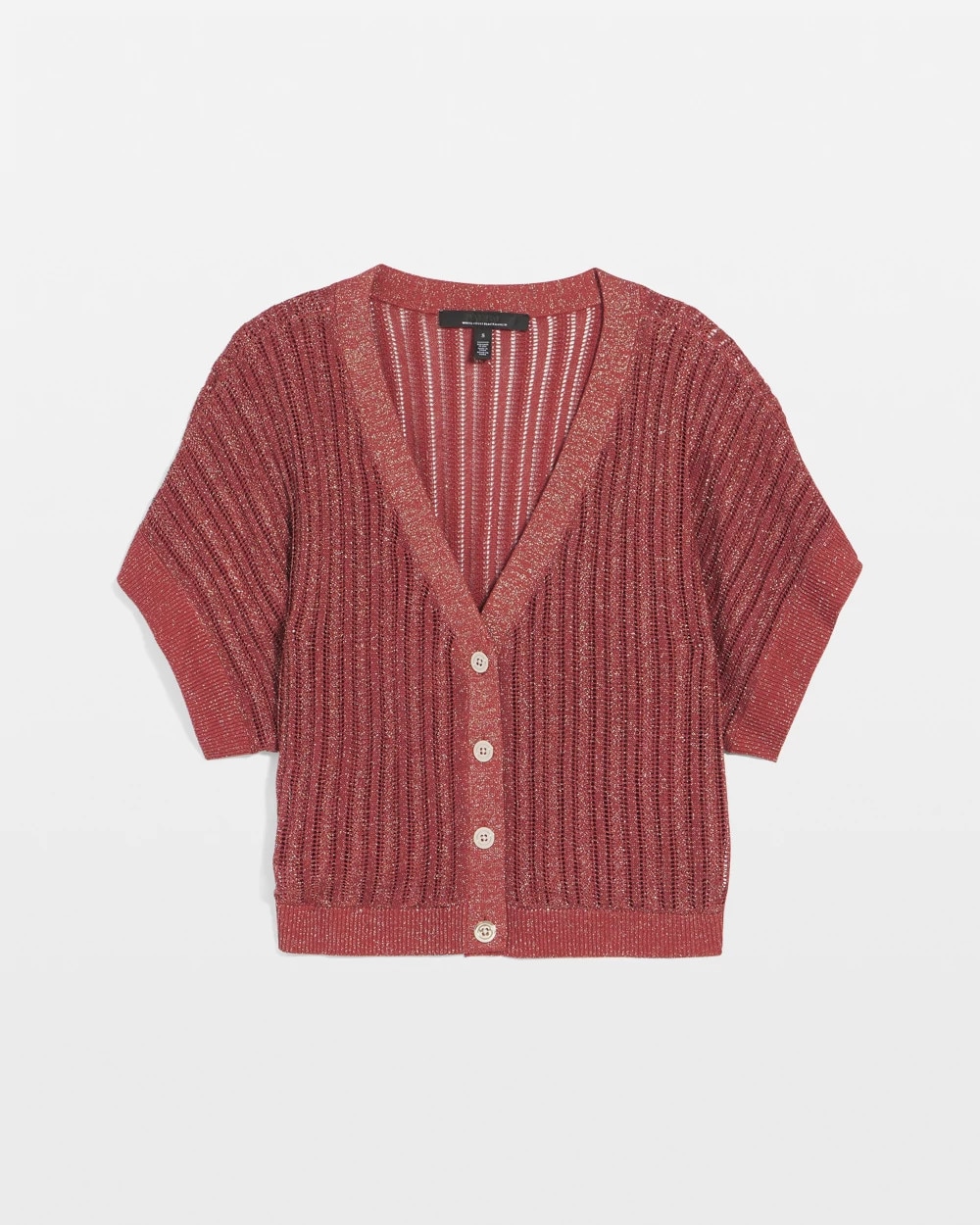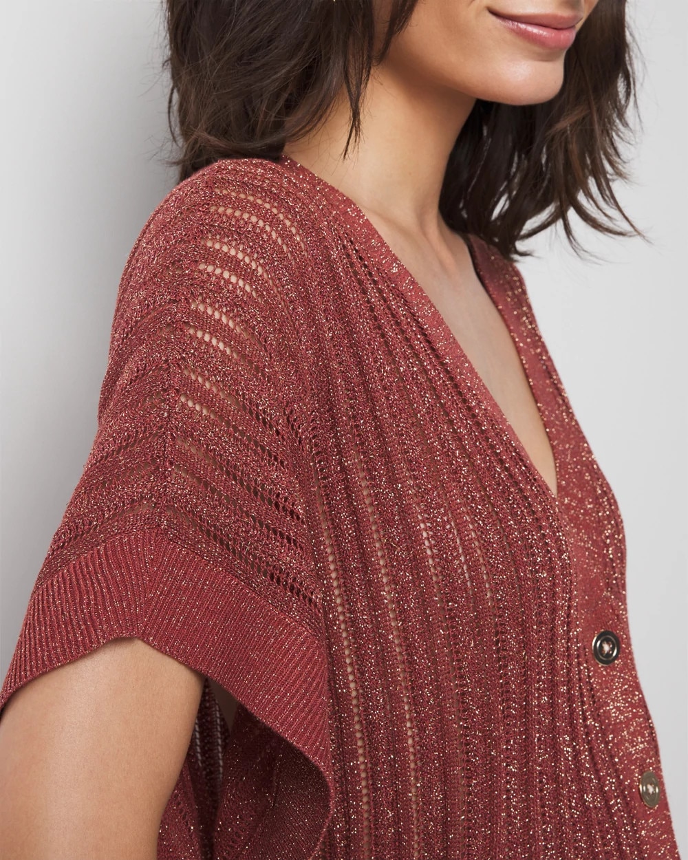 An open stitch pattern gives this cardi a slightly sheer look that’s perfect as a summer layer. Soft gold buttons and kimono sleeves make it fashion.