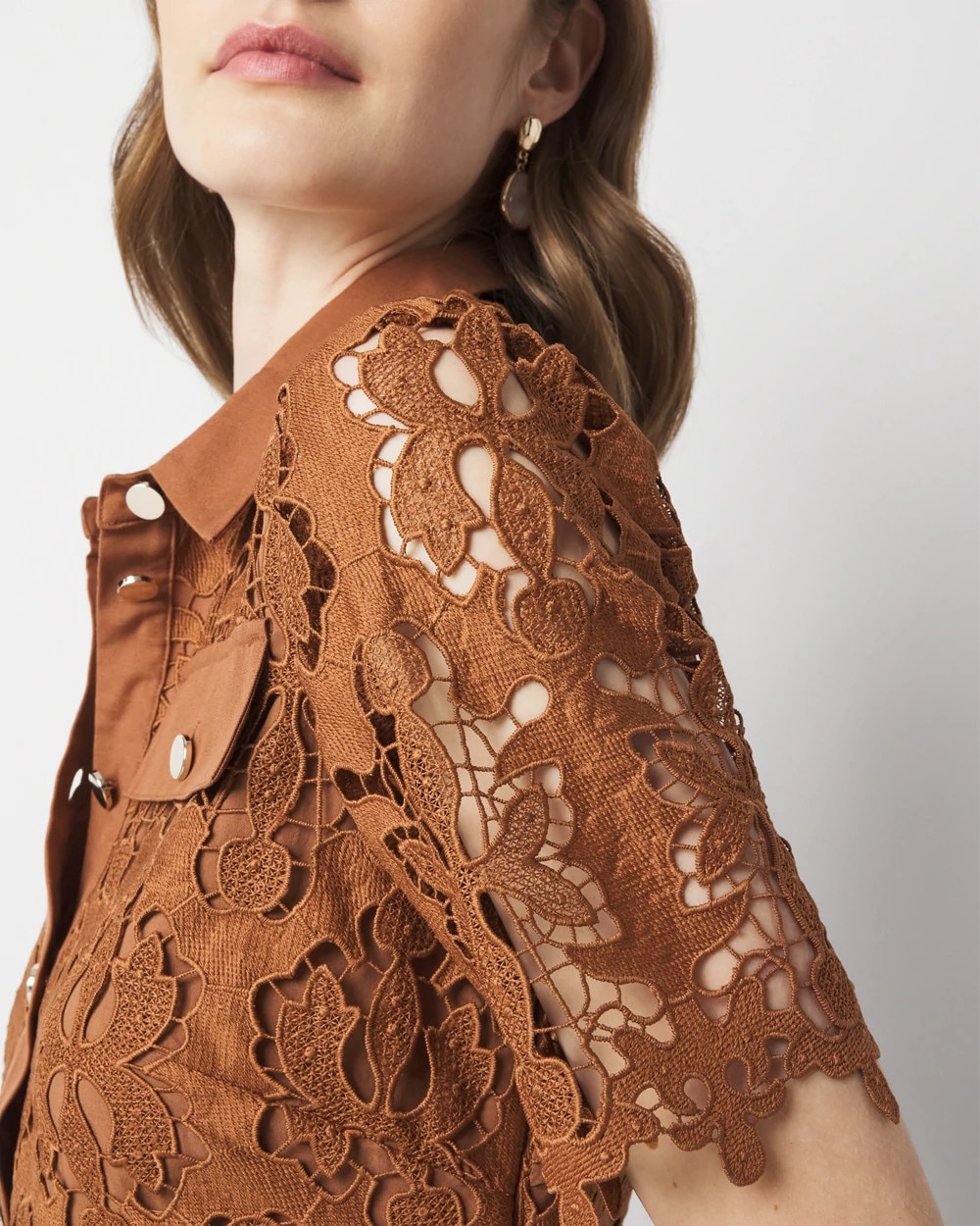 We put an extra feminine spin on the classic shirt dress by designing one in lace. The all over lace look is finished with a scalloped edge at the hem and cuffs. The partial front placket is functional so you may unbutton or button to the top depending on your preference. The faux pockets are a nod to the button-down shirt, a wardrobe staple that’s always timely.