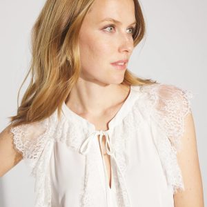 Feminine lace trims the flutter sleeves and the center front of this crepe fabric shell. The Y-neck has a tie-string which you can style as you choose. Wear under a blazer or on its own.