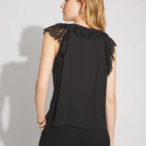 Feminine lace trims the flutter sleeves and the center front of this crepe fabric shell. The Y-neck has a tie-string which you can style as you choose. Wear under a blazer or on its own.