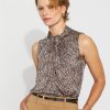 Feminine lace trims the flutter sleeves and the center front of this crepe fabric shell. The Y-neck has a tie-string which you can style as you choose. Wear under a blazer or on its own.