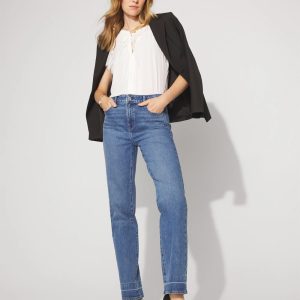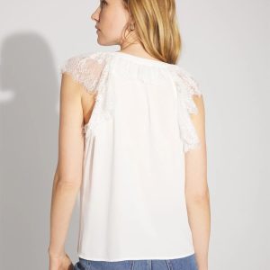 Feminine lace trims the flutter sleeves and the center front of this crepe fabric shell. The Y-neck has a tie-string which you can style as you choose. Wear under a blazer or on its own.