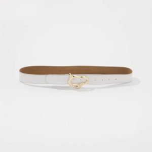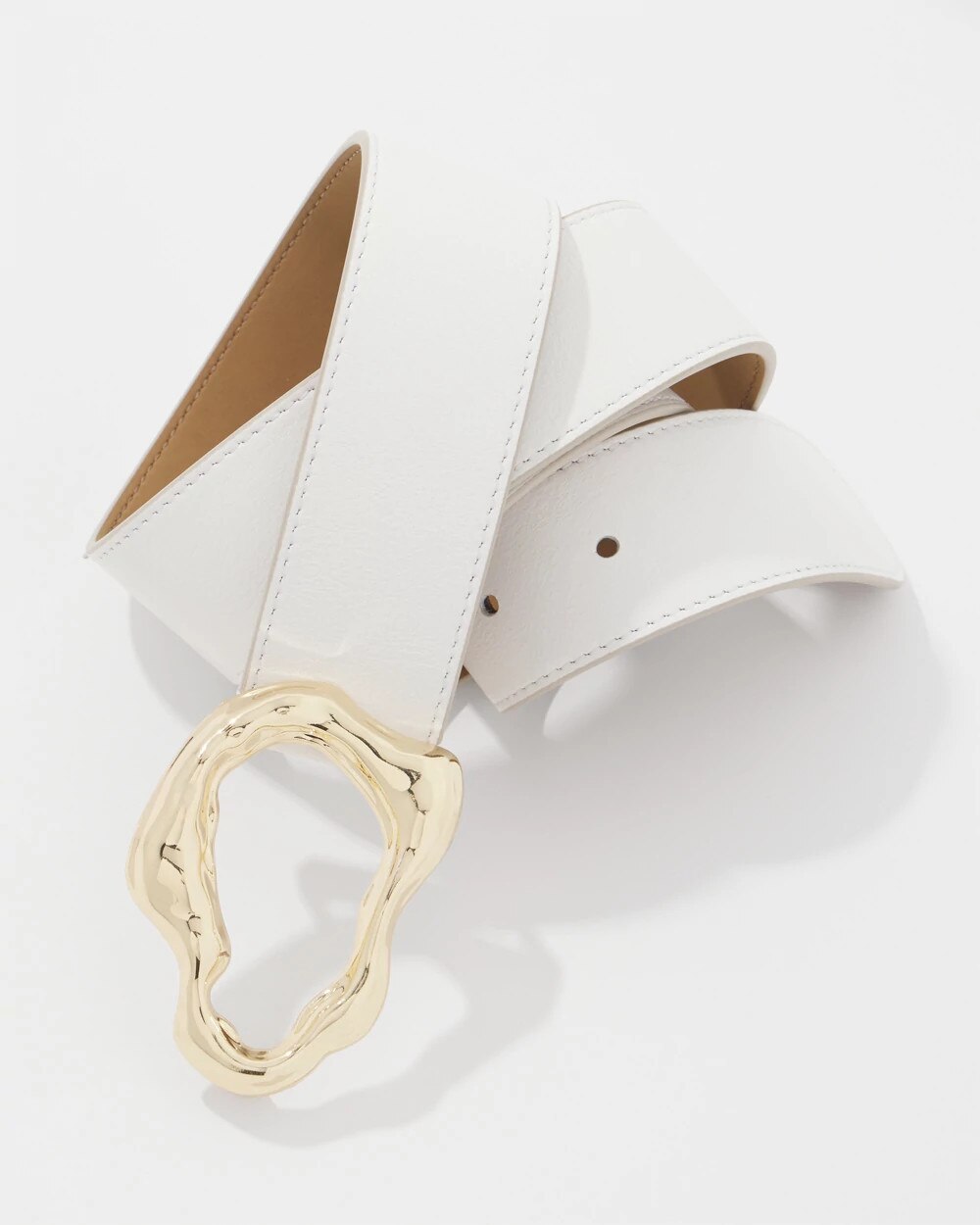 Instantly elevate your jeans or shorts with this ecru leather belt with a sculptural gold buckle. Also available in black with silver buckle.