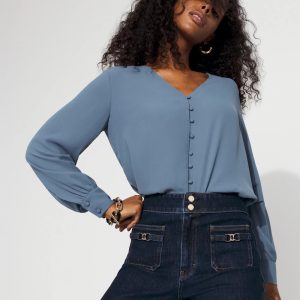 Timeless + chic, this long-sleeve blouse is adorned with self-covered buttons. Made from a crepe fabric that gives you a stylish drape. An easy office-ready look.