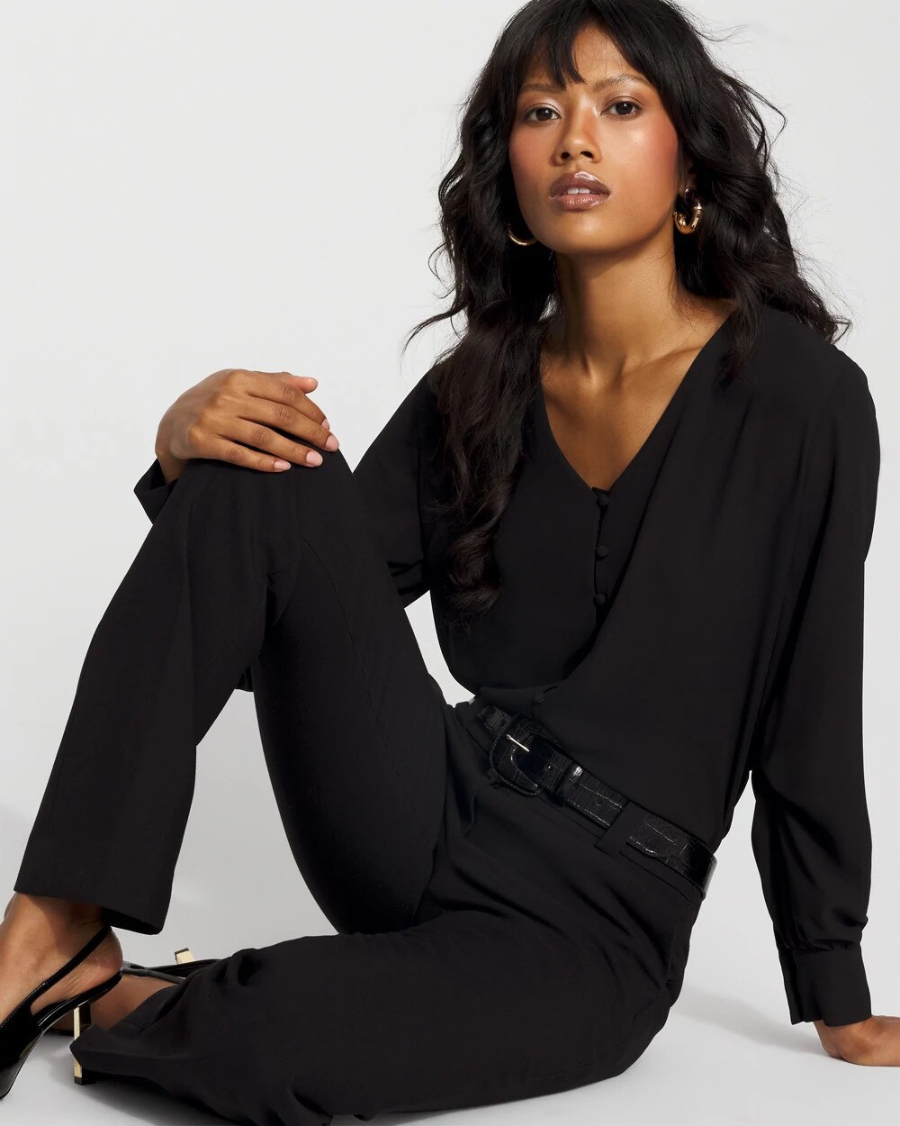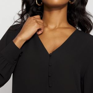 Timeless + chic, this long-sleeve blouse is adorned with self-covered buttons. Made from a crepe fabric that gives you a stylish drape. An easy office-ready look.