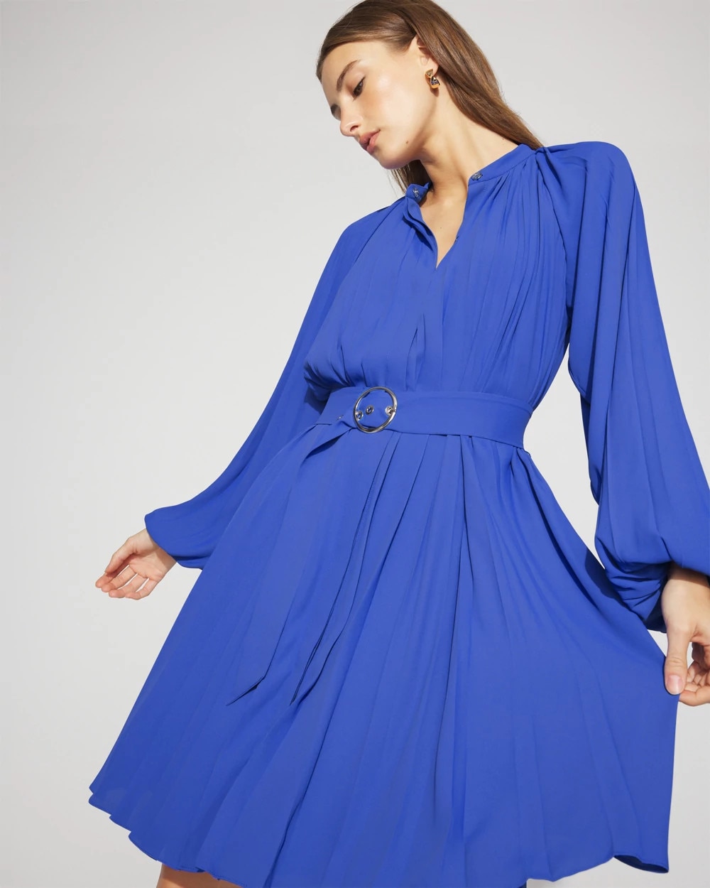 Long-Sleeve Pleated Belted Dress