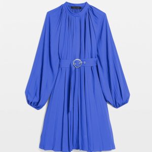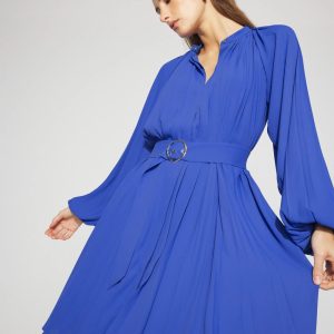 Long-Sleeve Pleated Belted Dress