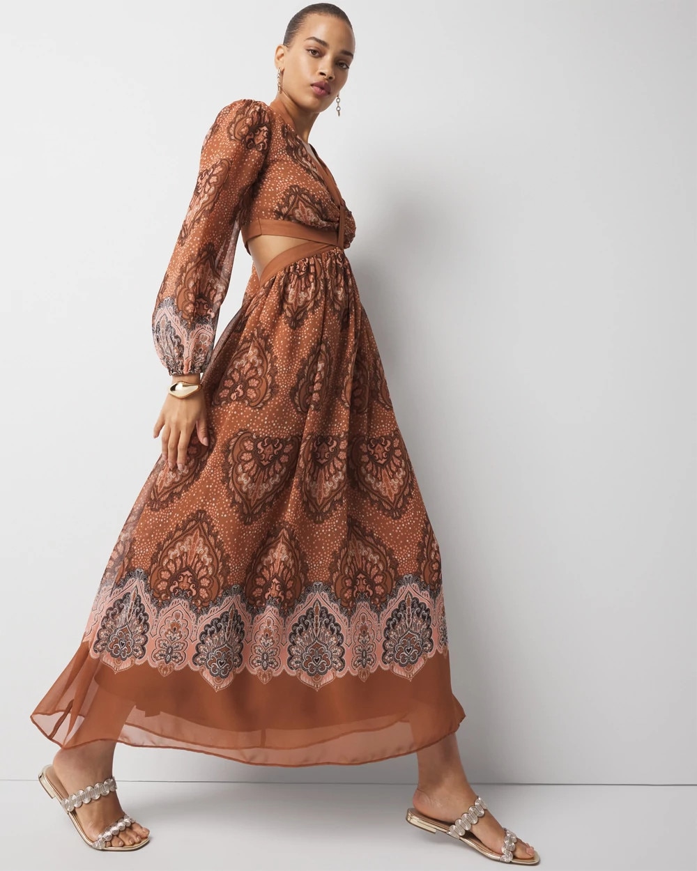 Reach for this dress when you want to turn heads. Thanks to the deep V-neckline and cut-outs on the sides and back, this midi dress is statement-making. The long sleeves have elastic at the cuffs for a blouson effect. A romantic + modern style.