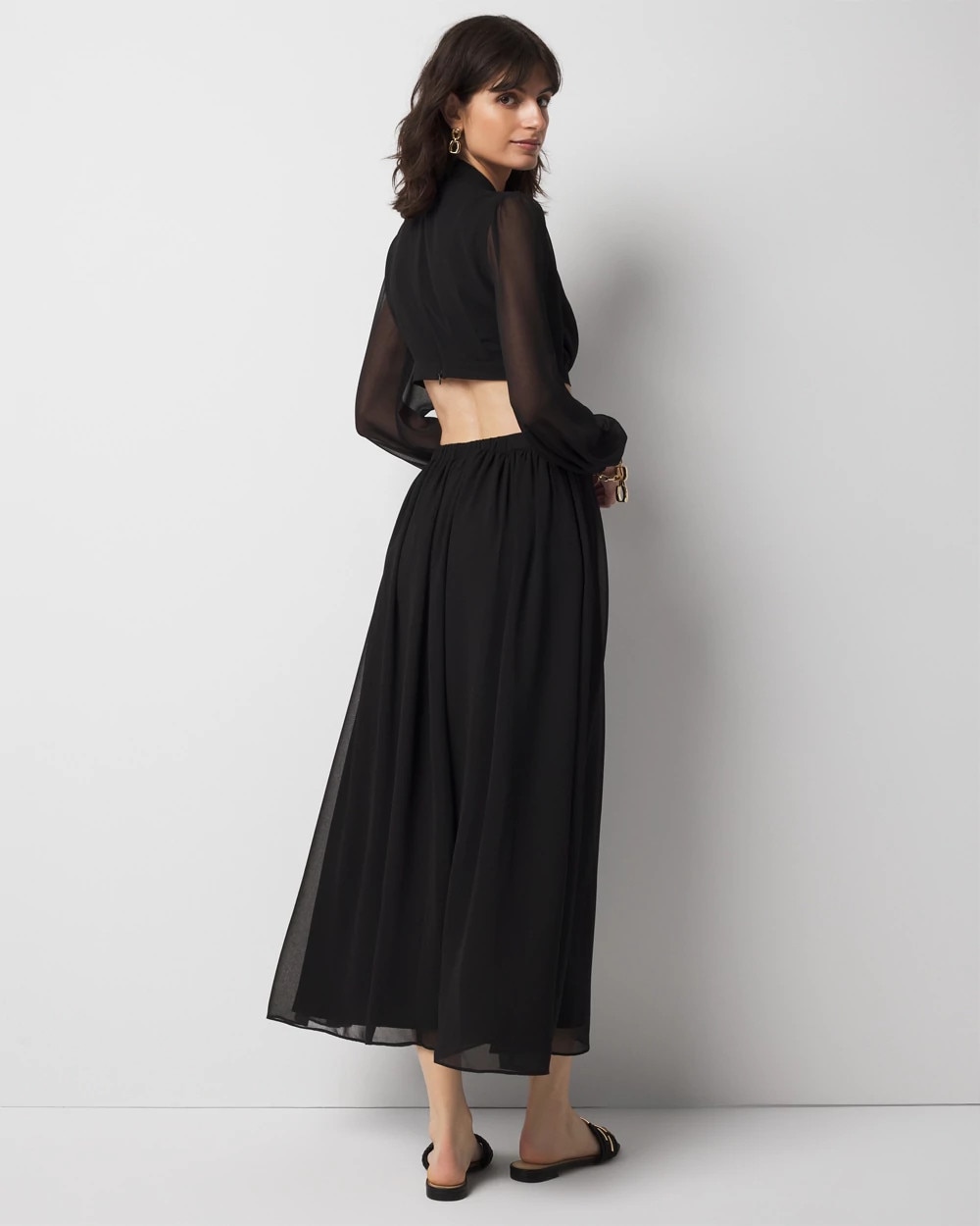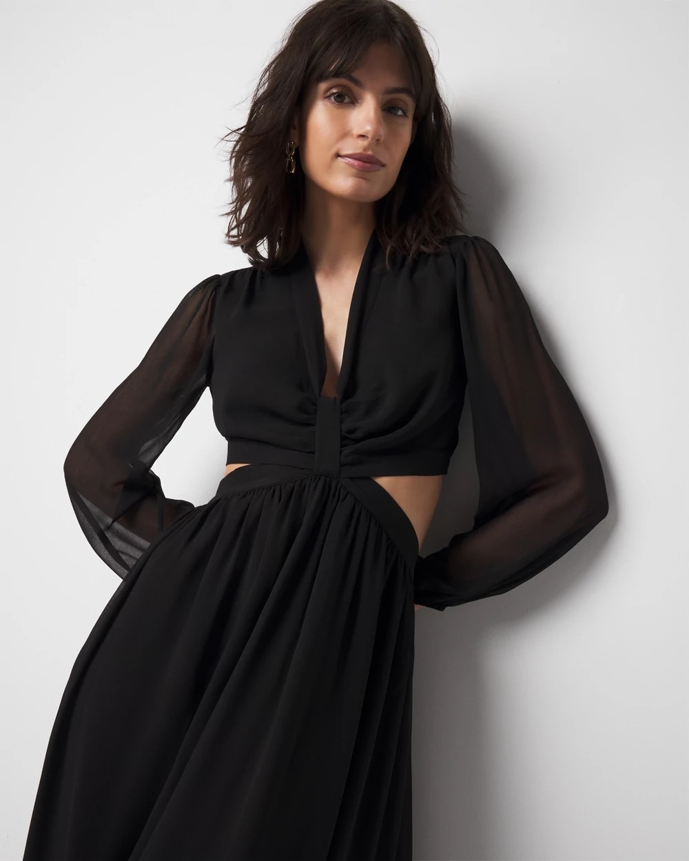 Reach for this dress when you want to turn heads. Thanks to the deep V-neckline and cut-outs on the sides and back, this midi dress is statement-making. The long sleeves have elastic at the cuffs for a blouson effect. A romantic + modern style.