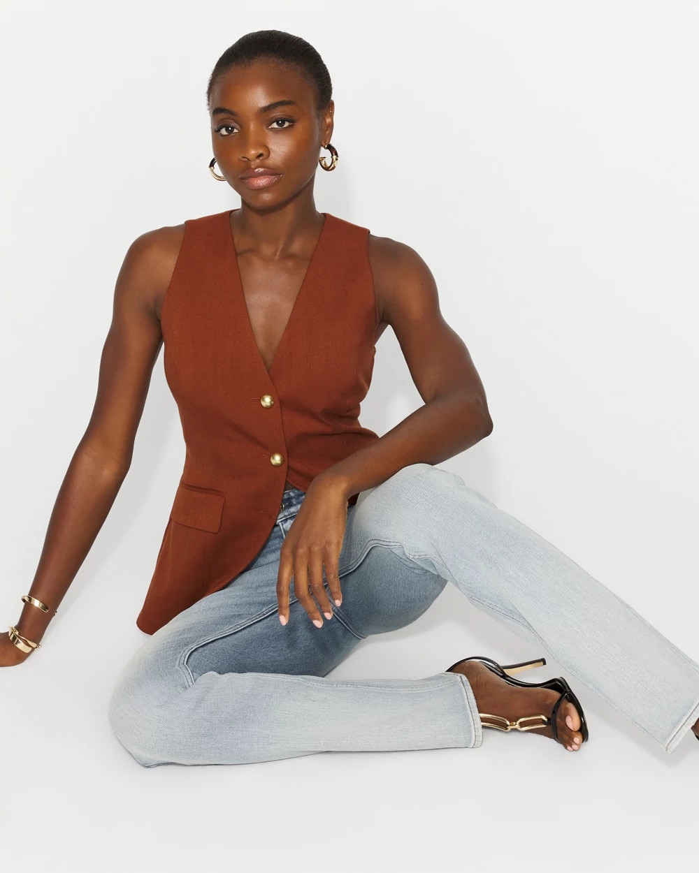 This timeless vest is designed with gold buttons and faux pockets. The longer length is super flattering. Wear it with the matching New Blake Mariner Boot Pant for head-to-toe chic.