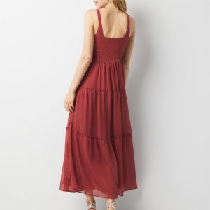 Airy chiffon crafted with metallic lurex to add shimmer, this dress is sure to stun thanks to the patriotic paisley print. The pleating adds textural interest, and flows out beautifully into tiered ruffles. Keep it classic with a jean jacket and flats or dress it up with strappy sandals and statement earrings.