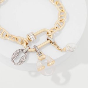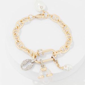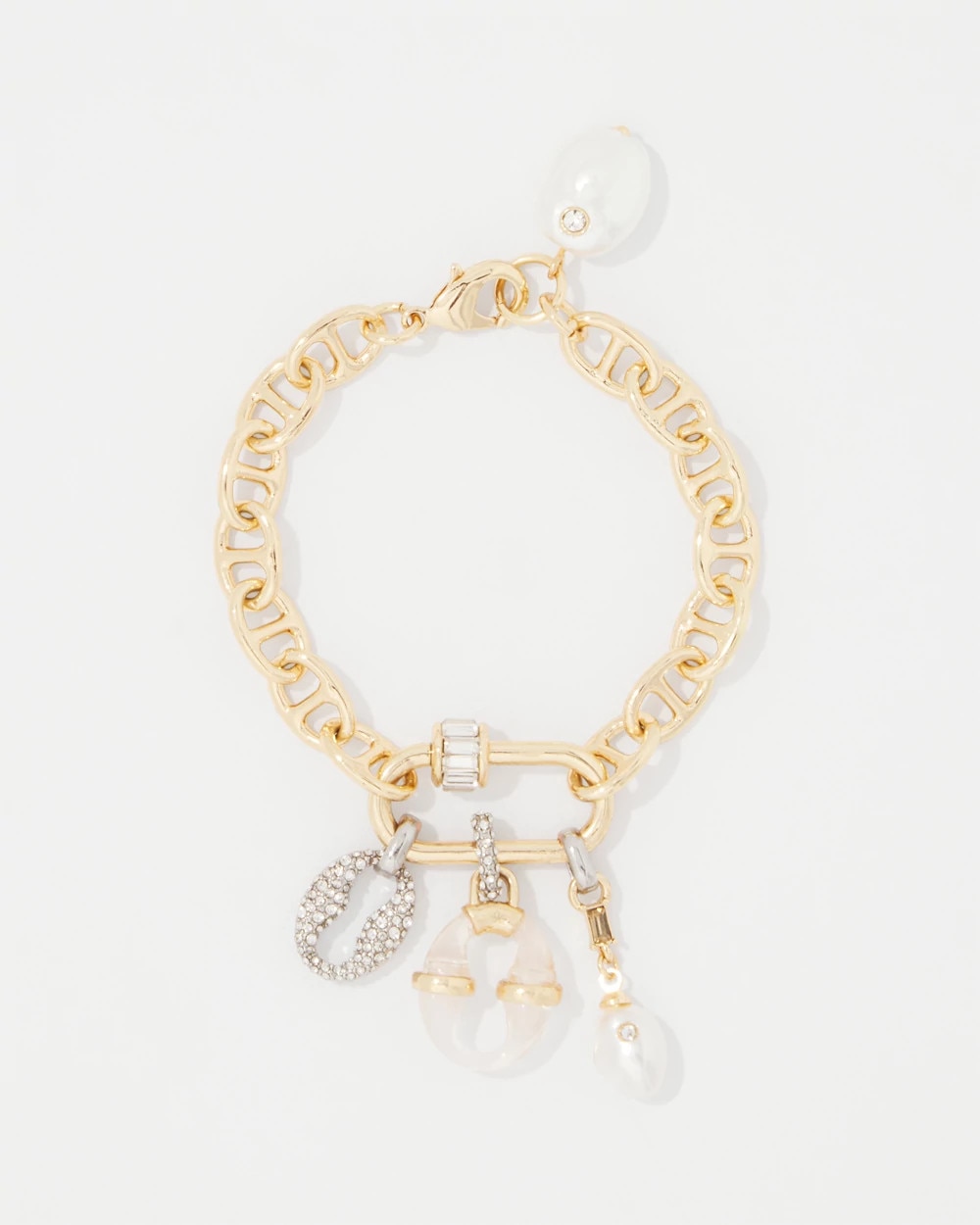 Two mariner links – oval shaped links with a bar that form a chain attached to a boat’s anchor – and a faux pearl make up the striking charms dangling from this chain bracelet. Pair it with matching charm necklace and earrings.