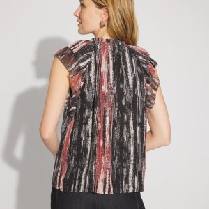 A sleeveless chiffon top with a metallic clip throughout the fabric to add subtle shimmer. The feminine flutter sleeves have a picot edge finish, and the ruffle neckline has a tie you can wear tied up or left open. A great top to layer under a blazer for work.