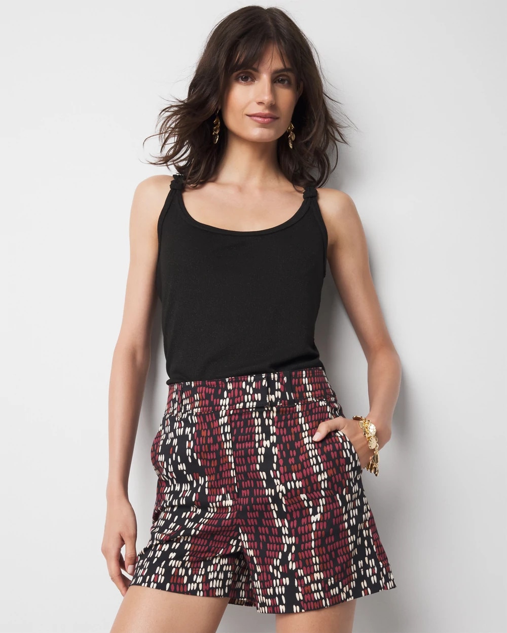 This metallic knit tank has knotted details that split over the shoulder. A relaxed yet elevated tee that will dress up your denim or shorts.