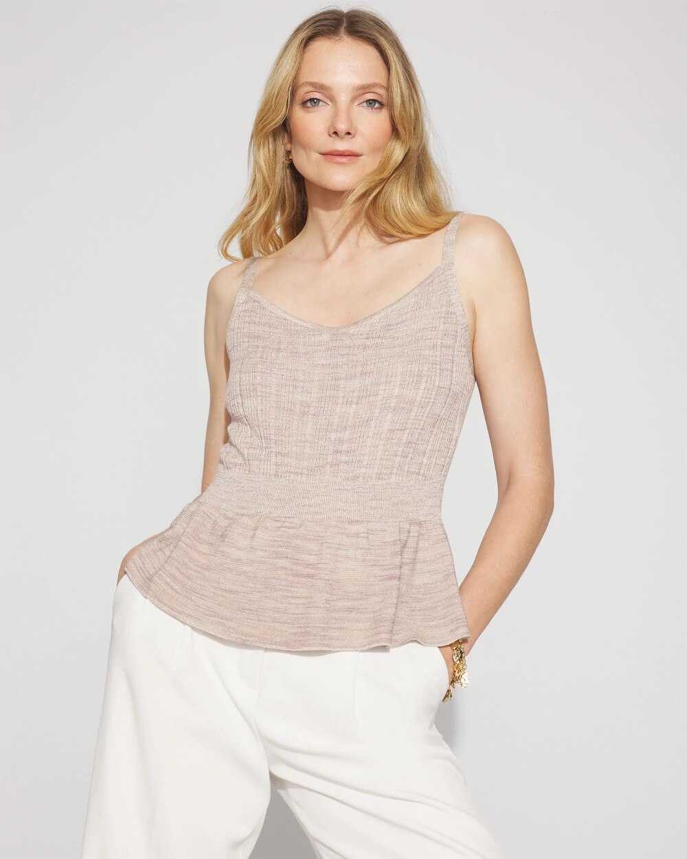 A peplum hem adds a feminine touch to this tank top. Made from a space-dyed yarn with lurex for on-trend shine, the bodice is a ribbed knit with a V-neck. The straps are adjustable.