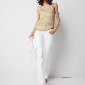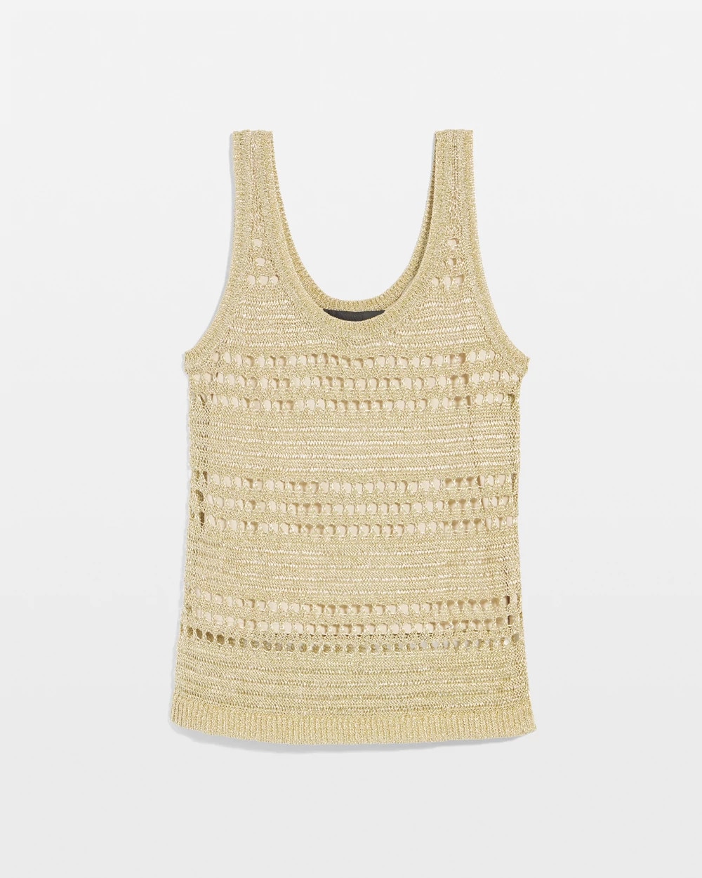 Add a dose of shine to your summer outfit with this metallic scoop neck tank top. Designed with contrast piping details along the neckline, sleeve holes and hem. A great look to pair with denim or shorts.
