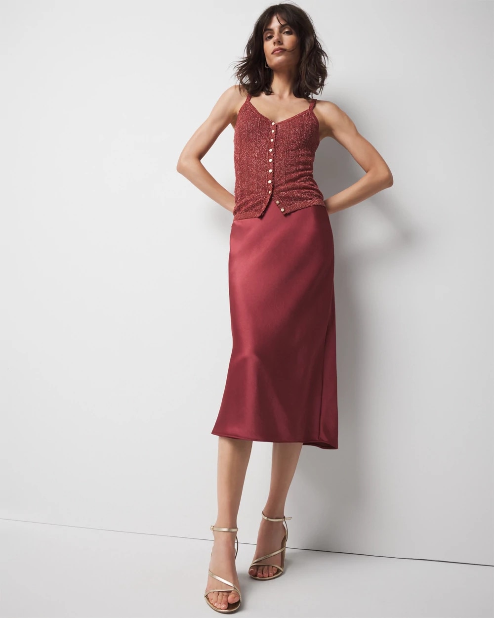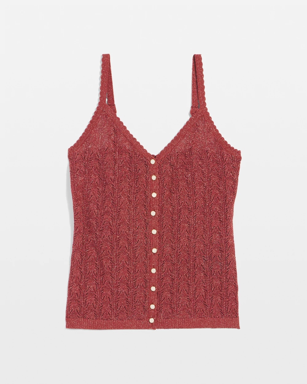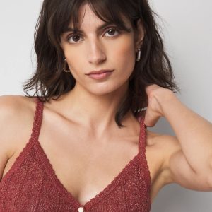 Made from a lightweight Tencel, linen and metallic blend yarn, this sweet cami will liven up your jeans or workwear. The buttons are fully functional, and the straps are adjustable. It’s slightly sheer and requires a bra underneath.