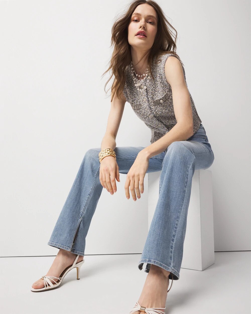 Elevate your workwear with this metallic tweed sweater vest that owes its style to European runways. Designed with button closure and buttons on the pocket flaps, this vest pairs with a matching skirt for a head-to-toe look. Wear with or without a shirt under the vest.