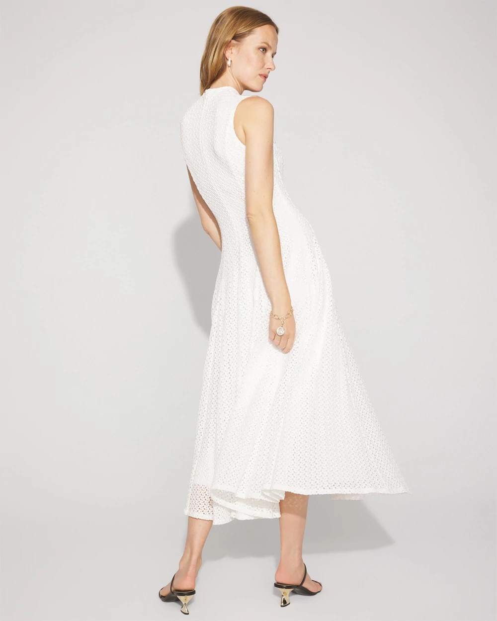 Crafted from a soft, stretchy knit lace, this midi dress is designed with a modern mock neck and a godet pleated skirt for fullness. A look that’s form-fitting + feminine and can easily go to brunch or dinner.
