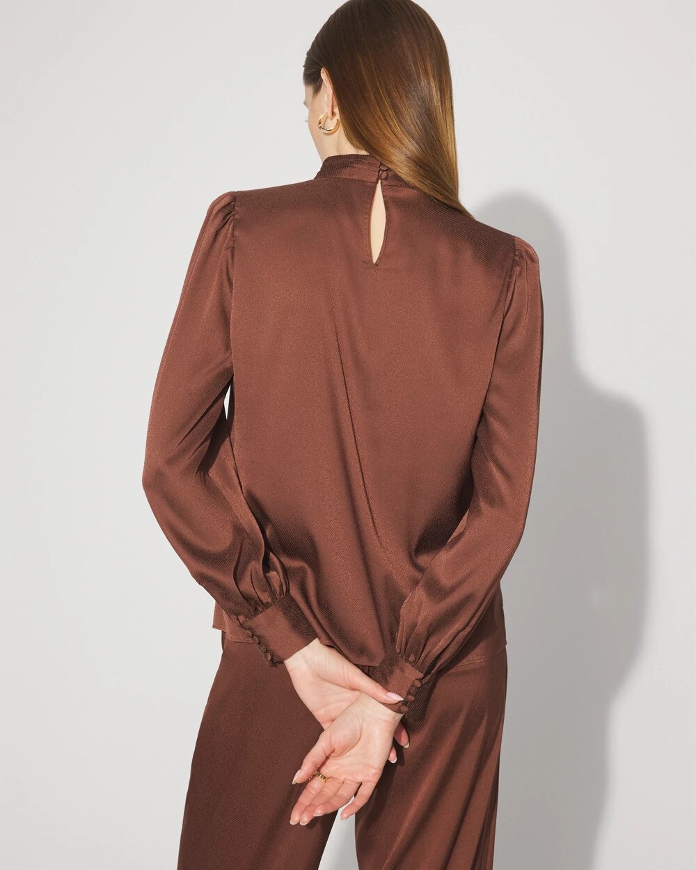 A twist detail creates a draped effect on one shoulder of this satin mock neck blouse. Three-buttons do up at the back of the neck and on the cuffs. A subtle jacquard stripe adds texture, and soft shirring at the shoulder soften the look. This is a chic look for the office when paired with black pants or trousers.