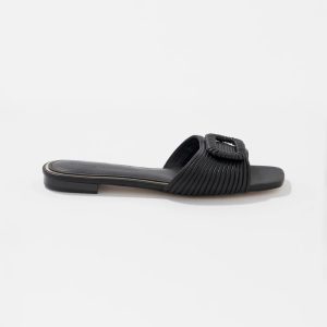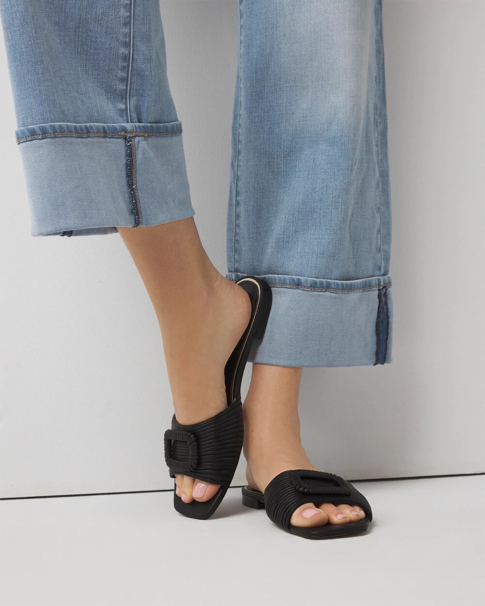 This slide is a modern design with faux leather straps and buckle that works for everyday wear. Perfect for shorts and denim or dresses.