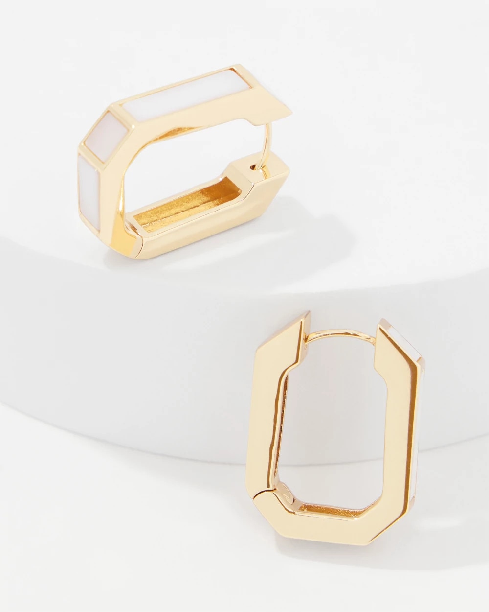These huggie hoop earrings are inlaid with mother of pearl for an iridescent and pretty look. Pair with matching mother of pearl cuff bracelet.