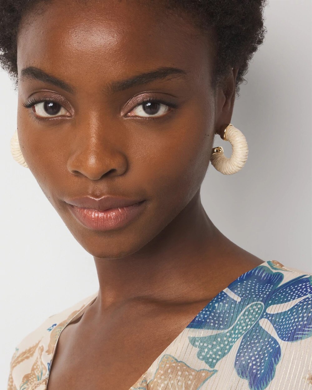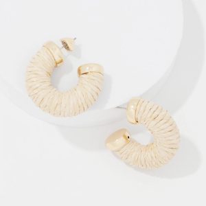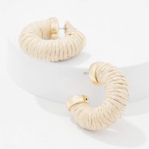 These timeless hoop earrings are wrapped in natural raffia, a material long associated with summer fashion. Pair with its matching necklace and bracelet.